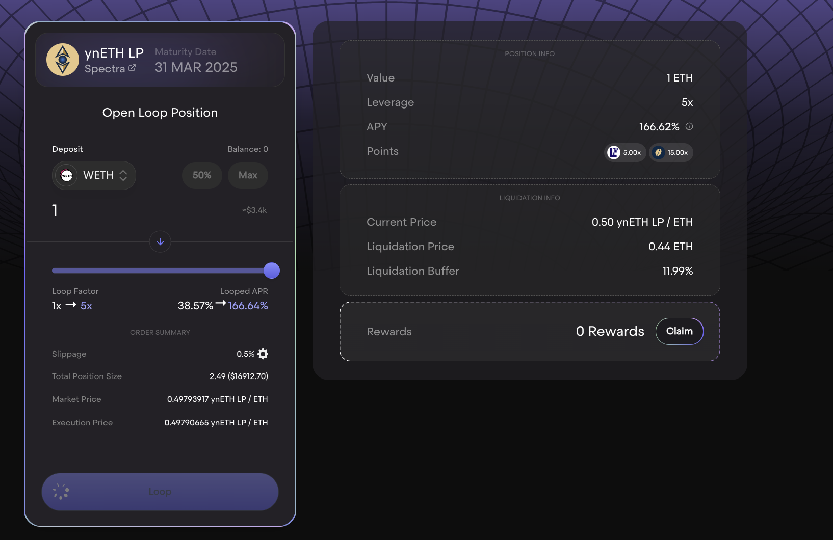 <table><thead><tr><th width="233">Label</th><th>Description</th></tr></thead><tbody><tr><td><strong>Loop Factor</strong></td><td>How much the position size is leveraged with borrowed capital</td></tr><tr><td><strong>Looped APR</strong></td><td>The looped Annual Percentage Rate (APR) is a dynamic figure that adjusts with fluctuations in the Base APR or interest rates. It encompasses the leveraged Base APR, the interest paid, and, if applicable, the Boost APR. This calculation does not take into account the effects of compound interest.</td></tr><tr><td><strong>Slippage</strong></td><td></td></tr><tr><td><strong>Total Position Size</strong></td><td>The total value that is invested in the yielding asset comprises both the principal and the borrowed capital. Price impact is not considered with this value. </td></tr><tr><td><strong>Market Price</strong></td><td></td></tr><tr><td><strong>Execution Price</strong></td><td></td></tr><tr><td><strong>Boost Position (Toggle)</strong><br><em><strong>(will only live after the TGE)</strong></em></td><td>Activating the toggle locks 6% of the Total Position Size in the dynamic Liquidity Pool (dLP) for one month. This action activates the boost, enabling the receipt of interest rebates through LOOP emissions (Boost APR) and additional dLP APR. For those wishing to lock more than 6% or extend the duration beyond one month, adjustments can be made on the Homepage or the dLP page.</td></tr></tbody></table>